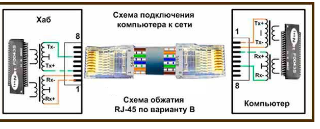 Для прикладу показана схема розпіновки rj 45, в якій беруть участь зелена і помаранчева. Для обтиску іншого типу, помаранчеву замінює коричнева, а зелену - синя. Але схема підключення контактів залишається незмінною.