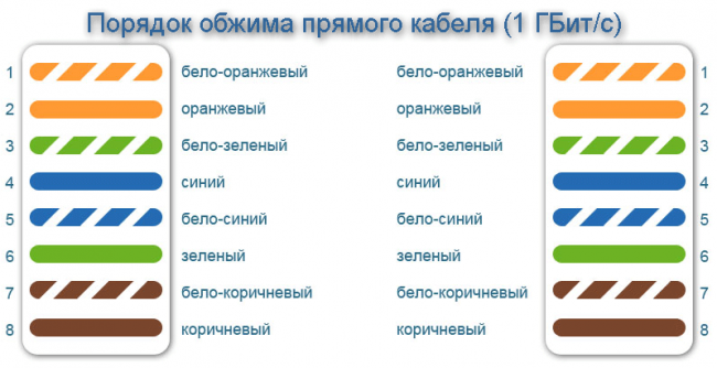 Для виготовлення прямого виду, можна використовувати будь-яку схему обтиску, головна умова - обидва кінці кабелю обжимаються ідентично. Найчастіше при створенні прямого мережевого кабелю використовується схема 568В.