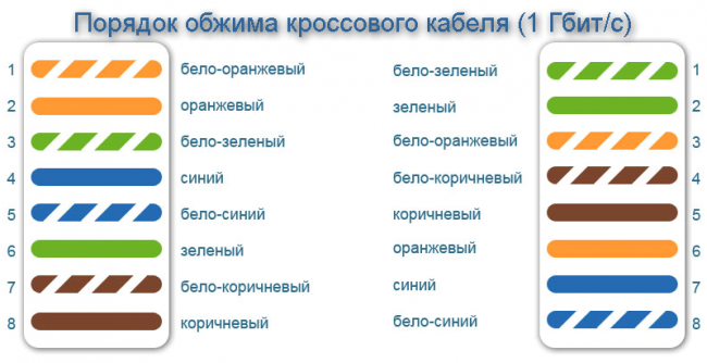 При виготовленні такого кабелю неодмінно беруть участь всі вісім мідних жил. Якщо потрібно виготовити кросовера, який забезпечить швидкість обміну даних між комп'ютерами до 1000 Мбіт/c, використовують особливий спосіб обтиску.