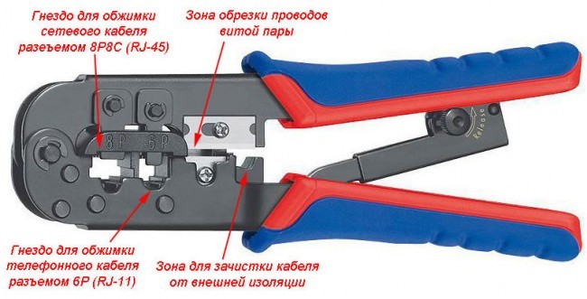 Для обтиску витої пари в RJ-45 знадобитися спеціальний інструмент - крімпер, особливий вид кліщів з декількома робочими зонами.
